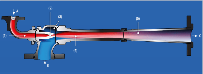 1. Chambre d’admission vapeur 2. Buse motrice 3. Tête 4. Convergent 5.Divergent