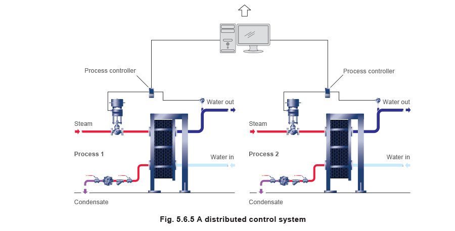 In the mid 1970’s, a number of well-known instrument companies began marketing digital control systems. These systems utilised a central computer unit, which took inputs from sensors, performed mathematical routines, and provided an output to various relevant controlling devices. They also maintained a record of events for review (see Figure 5.6.4).