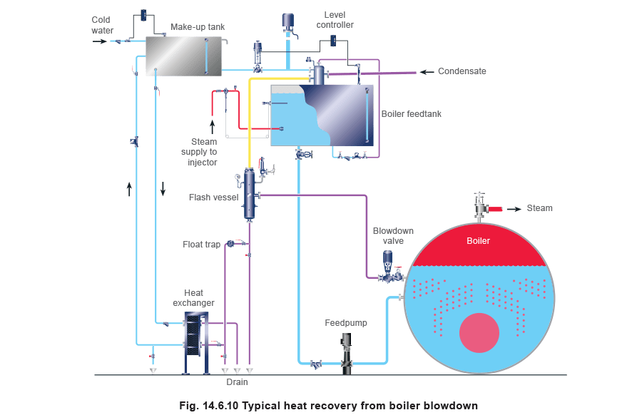 Boiler blowdown contains massive quantities of heat, which can easily be recovered as flash steam. After it passes through the blowdown control valve, the lower pressure water flows to a flash vessel. At this point, the flash steam is free from contamination and is separated from the condensate, and can be used to heat the boiler feedtank (see Figure 14.6.10).
