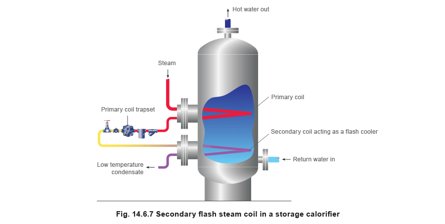 Condensate and flash steam from the trap on the primary coil is passed directly to the secondary coil. Here, any flash steam produced by the drop in pressure across the trap is condensed, while giving up its heat to the feedwater. A typical arrangement is shown in Figure 14.6.7.
