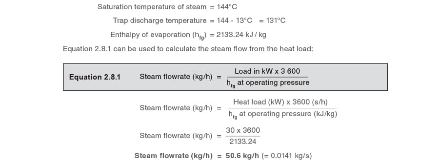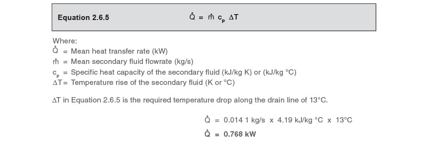 As the trap discharges at 131°C, the drain line has to emit enough heat such that the condensate at the heater outlet is at saturation temperature, and that condensate will not back-up into the heater. The required heat loss from the drain line can be calculated from Equation 2.6.5.