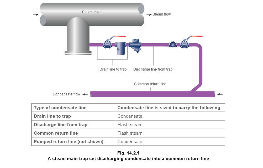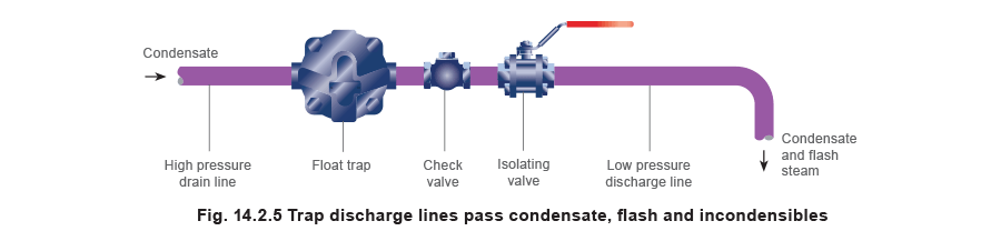 These pipes will carry condensate, incondensable gases, and flash steam from the trap to the condensate return system (Figure 14.2.5). Flash steam is formed as the condensate is discharged from the high-pressure space before the steam trap to the lower pressure space of the condensate return system. (Flash steam is discussed briefly in Module 14.1, and in more detail in Module 2.2).