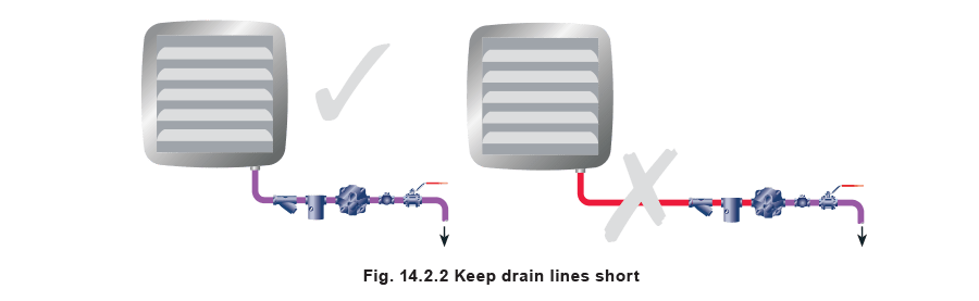 The drain line should be kept to a minimum length, ideally less than 2 metres. Long drain lines from the plant to the steam trap can fill with steam and prevent condensate reaching the trap. This effect is termed steam locking. To minimise this risk, drain lines should be kept short (see Figure 14.2.2). In situations where long drain lines are unavoidable, the steam locking problem may be overcome using float traps with steam lock release devices. The problem of steam locking should be tackled by fitting the correct length of pipe in the first place, if possible.