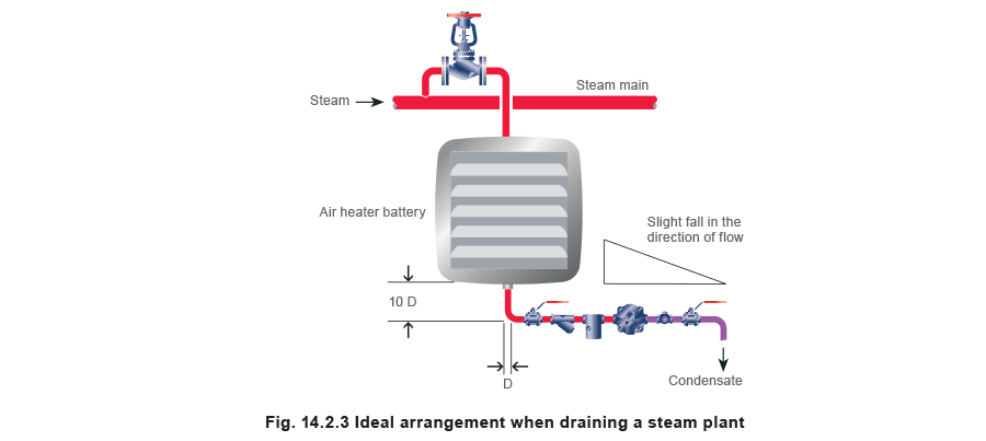 With steam-using plant, the pipe from the condensate connection should fall vertically for about 10 pipe diameters to the steam trap. Assuming a correctly sized ball float trap is installed, this will ensure that surges of condensate do not accumulate in the bottom of the plant with its attendant risks of corrosion and waterhammer. It will also provide a small amount of static head to help remove condensate during start-up when the steam pressure might be very low. The pipework should then run horizontally, with a fall in the direction of flow to ensure that condensate flows freely (see Figure 14.2.3).