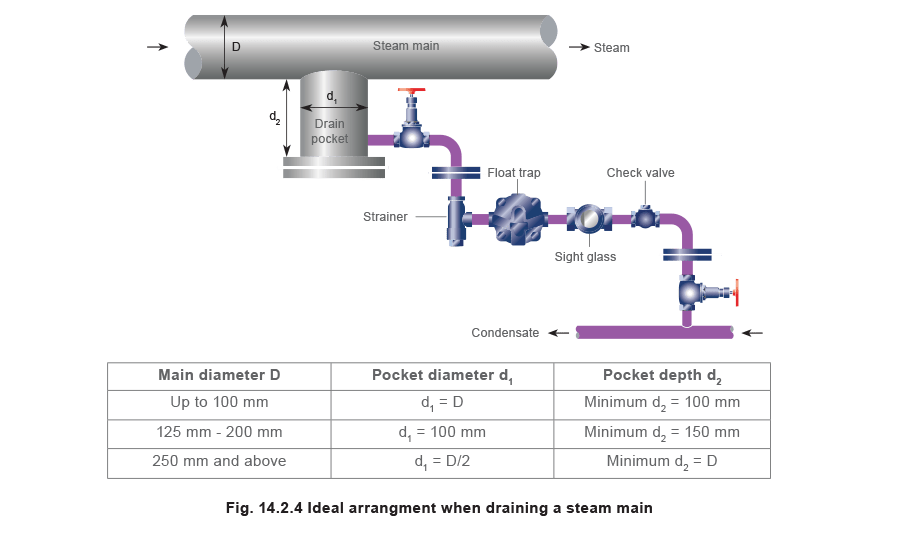 With steam mains drainage, provided drain pockets are installed as recommended in Module 10.3, then the drain line between the pocket and the steam trap may be horizontal. If the drain pocket is not as deep as the recommendation, then the steam trap should be fitted an equivalent distance below it (see Figure 14.2.4).