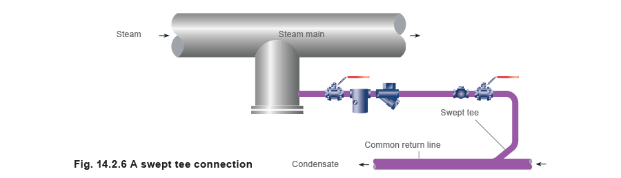 If blast discharge traps (thermodynamic or inverted bucket types) are used, the reactionary forces and velocities can be high. Swept tees will help to reduce mechanical stress and erosion at the point where the discharge line joins the common return line (see Figure 14.2.6).