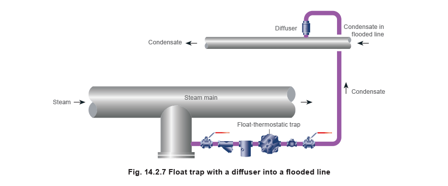 If, for some reason, swept tees cannot be used, a float-thermostatic trap with its continuous discharge action is a better option (Figure 14.2.7). The flooded line will absorb the dissipated energy from the (relatively small) continuous flow from the float-thermostatic trap, more easily.