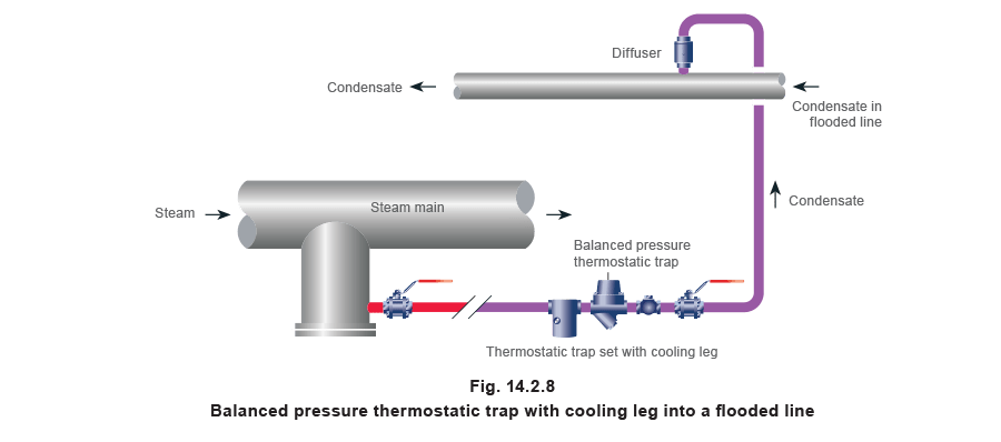 Another alternative is to use a thermostatic trap that holds back condensate until it cools below the steam saturation temperature; this reduces the amount of flash steam formed (Figure 14.2.8).