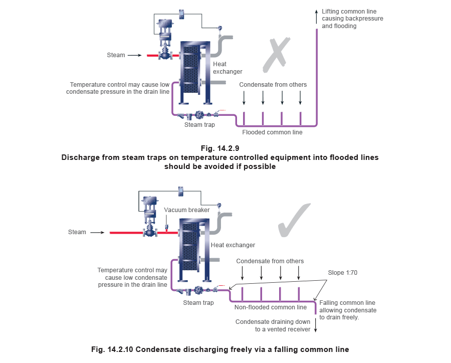 If the branch lines and the common line are correctly sized, the pressures downstream of each trap will be virtually the same. However, if these lines are undersized, the flow of condensate and flash steam will be restricted, due to a build up of backpressure caused by an increased resistance to flow within the pipe. Condensate flowing from traps draining the lower pressure systems will tend to be the more restricted.