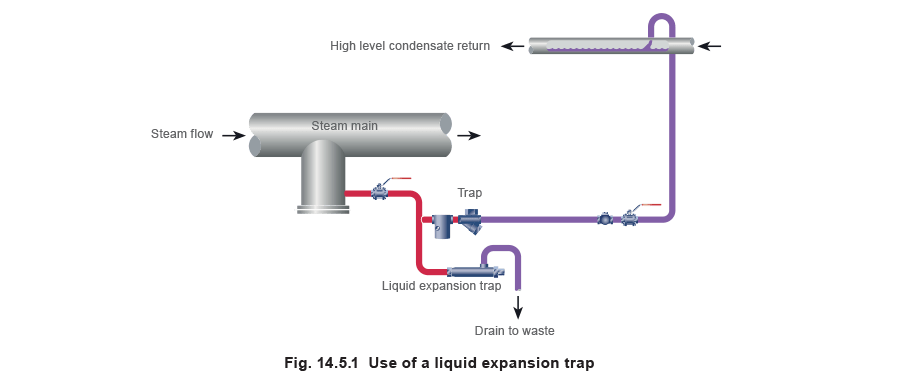 In steam mains at start-up, the steam pressure is likely to be very low, and it is common for water to back-up before the trap, which can lead to waterhammer in the space being drained. To alleviate this problem at start-up, a liquid expansion trap, fitted as shown in Figure 14.5.1, will discharge any cold condensate formed at this time to waste.