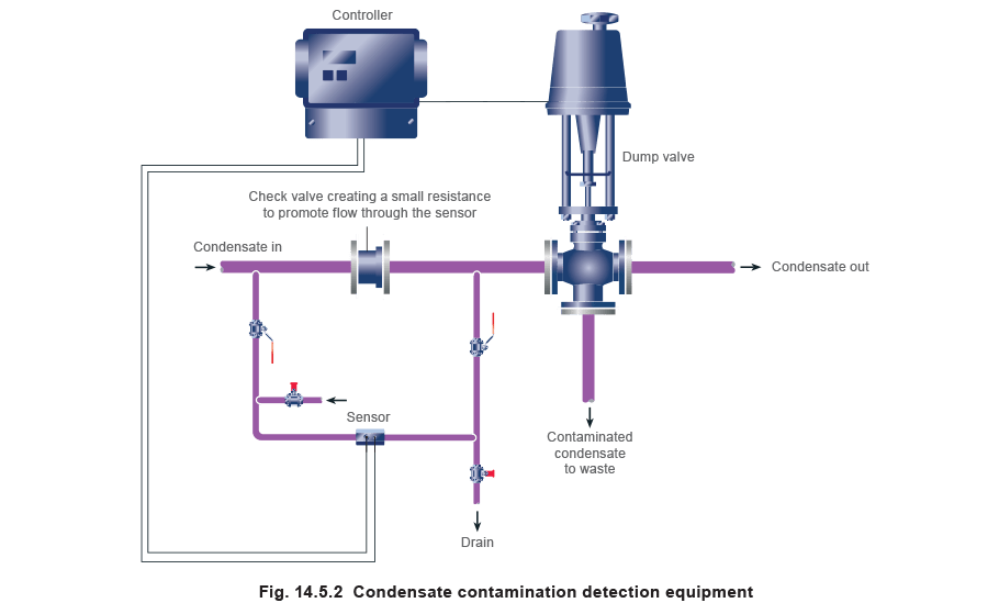 Such equipment detects changes in condensate conductivity. When a change from the desired conductivity occurs then this may mean that the condensate is contaminated. A controller signals a dump valve to open, allowing the condensate to flow to drain.