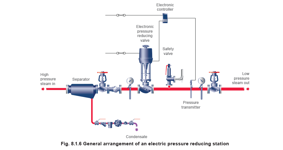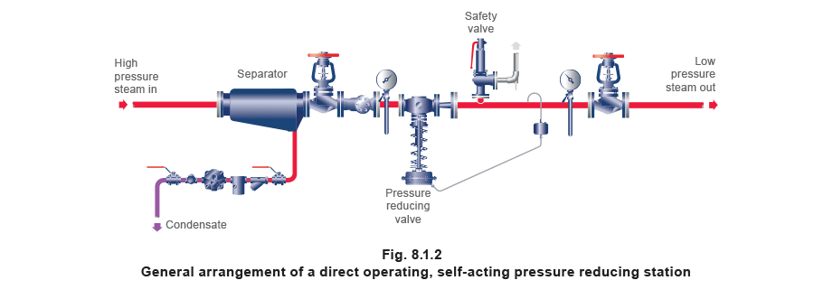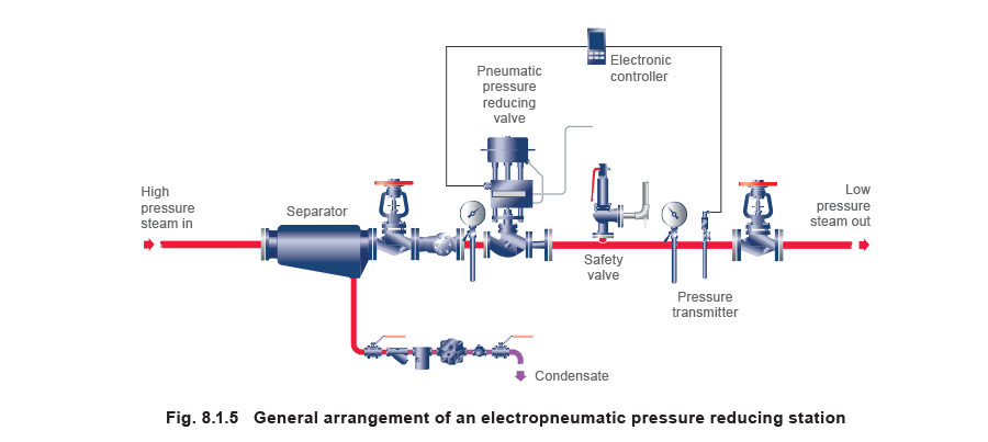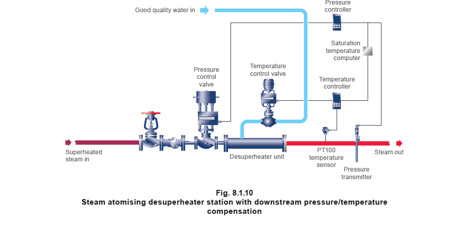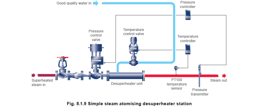 The system in Figure 8.1.9 illustrates an arrangement of a pressure reducing station with a direct contact type pipeline desuperheater.
