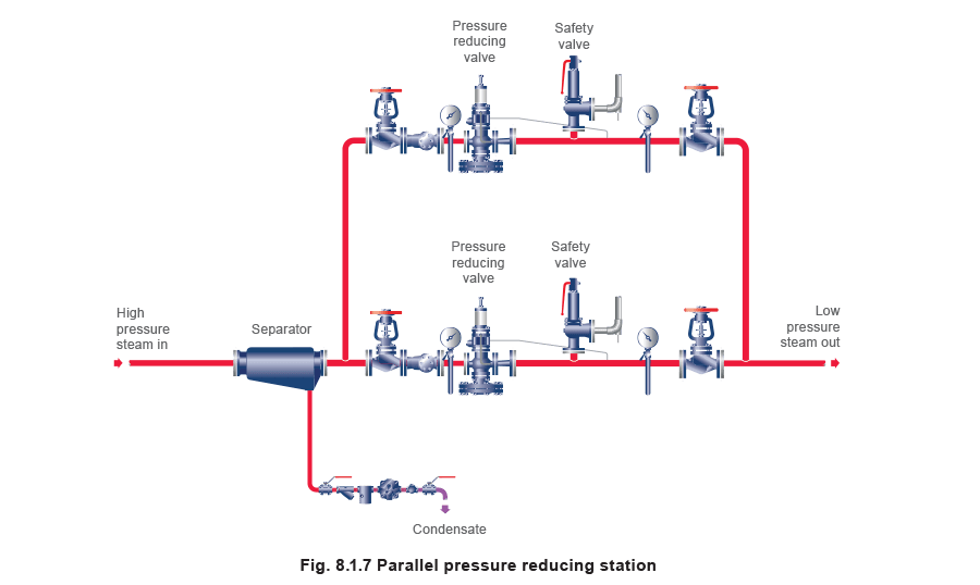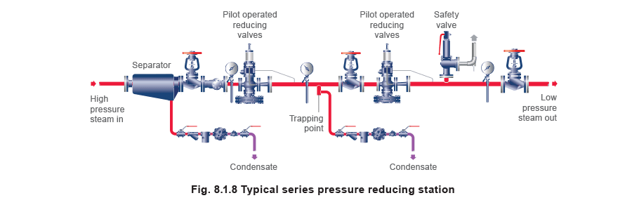 The trapping point between the two reducing valves (Figure 8.1.8) is to stop a build up of condensate under no-load conditions. If this were not fitted, radiation losses would cause condensate to fill the connecting pipe, which would cause waterhammer the next time the load increased.