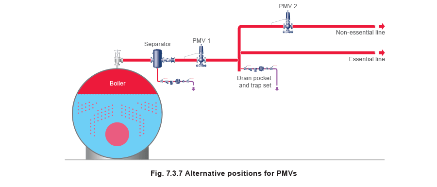 The cheapest solution might be to fit a PMV in the boiler steam outlet, (see PMV 1 in Figure 7.3.7). This will maintain a minimum steam pressure in the boiler, regulate maximum flow from the boiler and, in so doing, retain good quality steam to the plant.