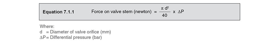 The required closing force on the valve plug is the product of the valve orifice area and differential pressure as shown in Equation 7.1.1. Note that for two-port steam valves, differential pressure should be taken as the upstream absolute steam pressure; whereas for two-port water valves it will be the maximum pump gauge pressure minus the pressure loss along the pipe between the pump and the valve inlet.