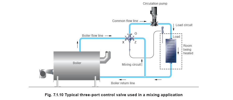 When a three-port control valve is used as a mixing valve (see Figure 7.1.10), the constant volume port ‘O’ is used as the common outlet.