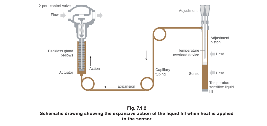If a temperature sensitive fluid is heated, it will expand. If it is cooled, it will contract. In the case of a self-acting temperature control, the temperature sensitive fluid fill in the sensor and capillary will expand with a rise in temperature (see Figure 7.1.2).