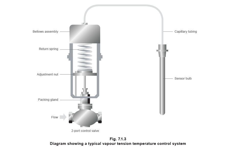A vapour tension control system has a sensing system filled with a mixture of liquid and vapour. An increase in the sensor temperature boils off a greater proportion of the vapour from the liquid held within it, increasing the vapour pressure in the sensor and capillary system. This increase in pressure is transmitted through the capillary to a bellows or diaphragm assembly at the opposite end (see Figure 7.1.3).