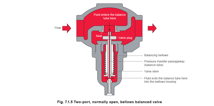 In a bellows balanced valve, a balancing bellows with the same effective area as the seat orifice is used to counteract the forces acting on the valve plug. A small hole down the centre of the valve stem forms a balance tube, allowing pressure from upstream of the valve plug to be fed to the bellows housing (see Figure 7.1.5). Similarly, the forces on the valve plug pressurise the inside of the bellows. The differential pressure across the bellows is therefore the same as the differential pressure across the valve plug, but since the forces act in opposite directions they cancel each other out.