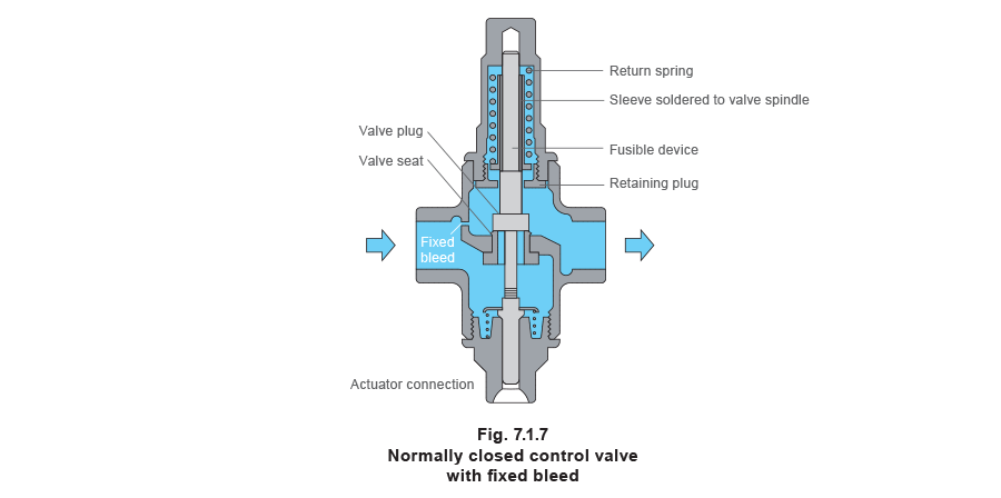 A normally closed valve might also have an optional fusible device (see Figure 7.1.7). The device melts in the event of excess heat, removing the spring tension on the valve plug and opening the valve to allow the cooling water to enter the system. It is usual with this kind of safety device, that once the fusible device has melted, it cannot be repaired and must be replaced.