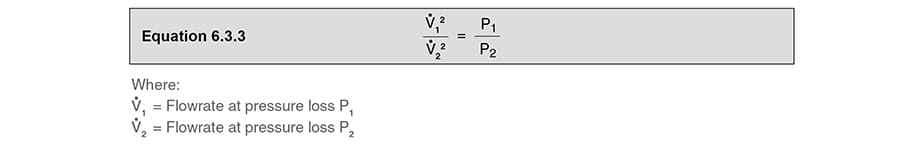 As water is circulated through a system, it will incur frictional losses. These frictional losses may be expressed as pressure loss, and will increase in proportion to the square of the velocity. The flowrate can be calculated through a pipe of constant bore at any other pressure loss by using Equation 6.3.3, where v̇1 and v̇2 must be in the same units, and P1 and P2 must be in the same units.are defined below.