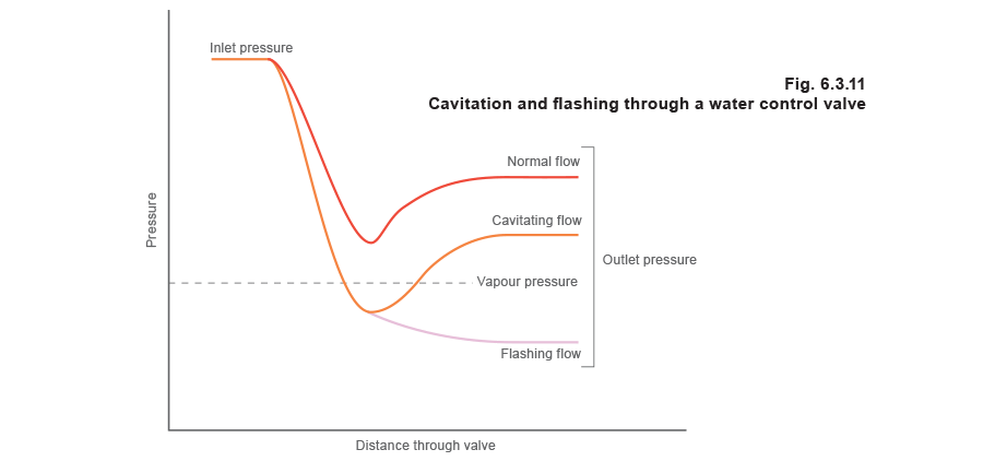 Flashing is a similar symptom to cavitation, but occurs when the valve outlet pressure is lower than the vapour pressure condition. Under these conditions, the pressure does not recover in the valve body, and the vapour will continue to flow into the connecting pipe. The vapour pressure will eventually recover in the pipe and the collapsing vapour will cause noise similar to that experienced with cavitation. Flashing will reduce the capacity of the valve due to the throttling effect of the vapour having a larger volume than the water. Figure 6.3.11 illustrates typical pressure profiles through valves due to the phenomenon of cavitation and flashing.