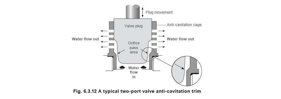 It is not always possible to ensure that the pressure drop across a valve and the temperature of the water is such that cavitation will not occur. Under these circumstances, one possible solution is to install a valve with a valve plug and seat especially designed to overcome the problem. Such a set of internals would be classified as an ‘anti-cavitation’ trim.