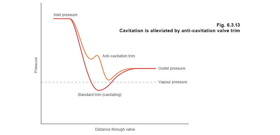 The pressure drop is split between the orifice pass area and the cage. In many applications the pressure does not drop below the vapour pressure of the liquid and cavitation is avoided. Figure 6.3.12 shows how the situation is improved.