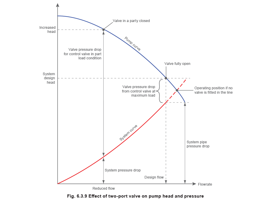 When a two-port valve is used on a water system, as the valve closes, flow will decrease and the pressure upstream of the valve will increase. Changes in pump head will occur as the control valve throttles towards a closed position. The effects are illustrated in Figure 6.3.9.