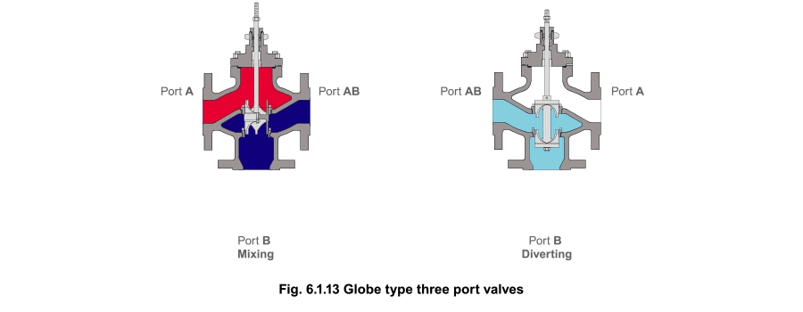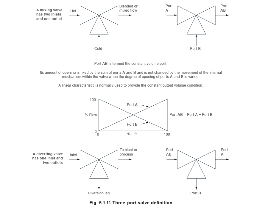 Three-port valves can be used for either mixing or diverting service depending upon the plug and seat arrangement inside the valve. A simple definition of each function is shown in Figure 6.1.11.