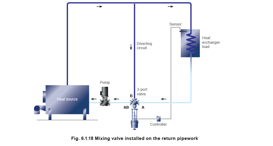 In Figure 6.1.18, the valve is designed as a mixing valve as it has two inlets and one outlet. However, when placed in the return pipework from the load, it actually performs a diverting function, as it diverts hot water away from the heat exchanger.