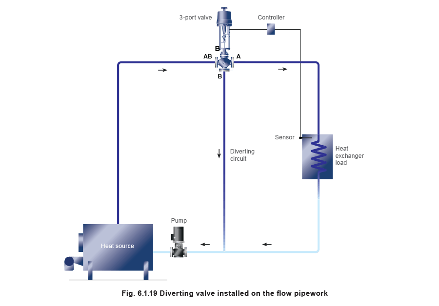 In closed circuits, it is possible to use mixing valves or diverting valves, depending upon the system design, as depicted in Figures 6.1.18 and 6.1.19.