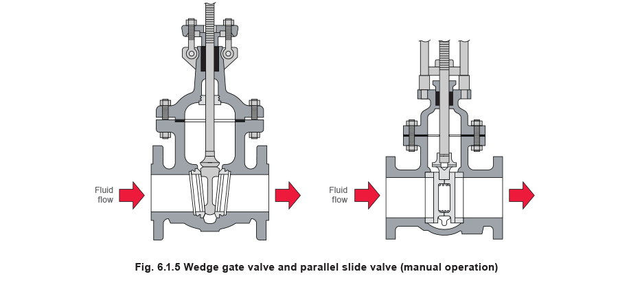 Slide valves tend to come in two different designs; wedge gate type and parallel slide type. Both types are well suited for isolating fluid flow, as they give a tight shut-off and, when open, the pressure drop across them is very small. Both types are used as manually operated valves, but if automatic actuation is required, the parallel slide valve is usually chosen, whether for isolation or control. Typical valves are shown in Figure 6.1.5.