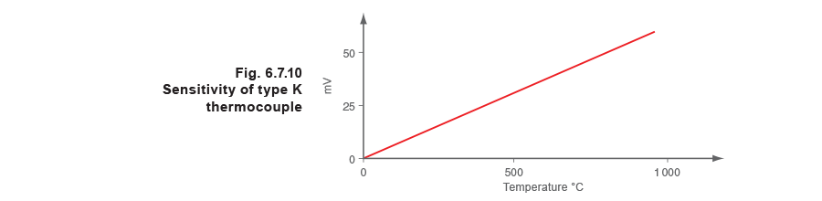 The dissimilar metals used in this type are Chrome (90% nickel, 10% chromium) and Alumel (94% nickel, 3% manganese, 2% aluminium and 1% silicon) and can be used between the range 0°C to 1 260°C. Figure 6.7.10 illustrates the sensitivity of Type K thermocouples, and it can be seen that the output voltage is linear across the complete range.