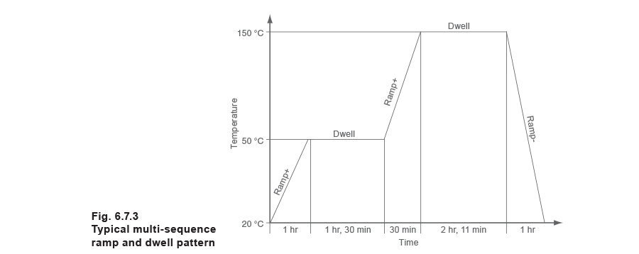 A single loop controller, which has the ability to perform ramp and dwell functions, may have a typical sequence pattern like the one shown in Figure 6.7.3. This shows a series of ramps (temperature change) and dwell (maintaining temperature) functions, carried out over a period of time