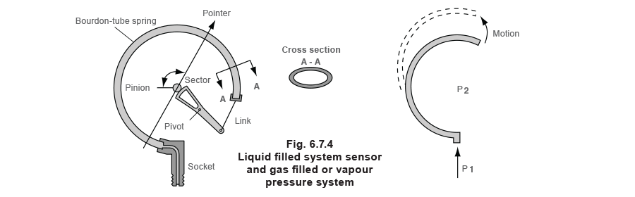 When the temperature changes, the fluid expands or contracts, causing the Bourdon tube to tend to straighten out. Sometimes a bellows is used instead of a Bourdon tube.