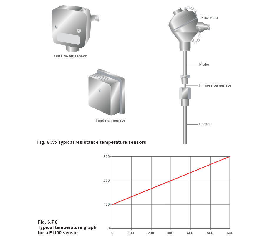 As can be seen from Figure 6.7.6, the increase of resistance with temperature is virtually linear. Pt100s have a relatively small change in resistance, which requires careful measurement. Resistance in the connecting cables needs to be properly compensated for.