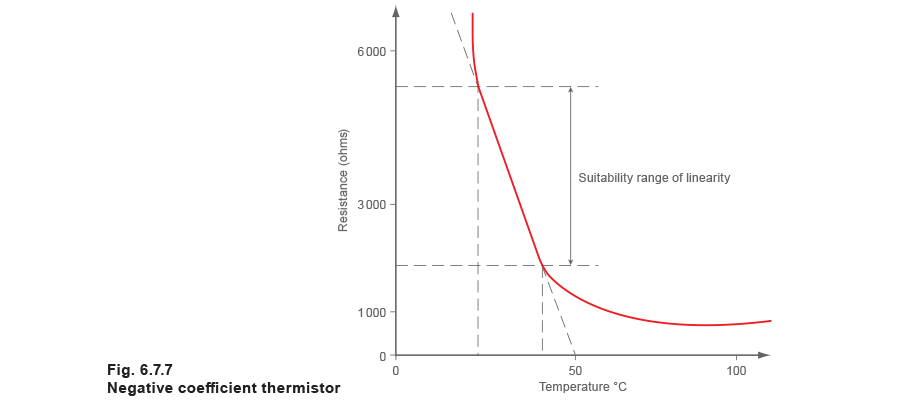 Thermistors use semi-conductor materials, which have a large change in resistance with increasing temperature, but are non-linear. The resistance decreases in response to rising temperatures (negative coefficient thermistor), as shown in Figure 6.7.7.