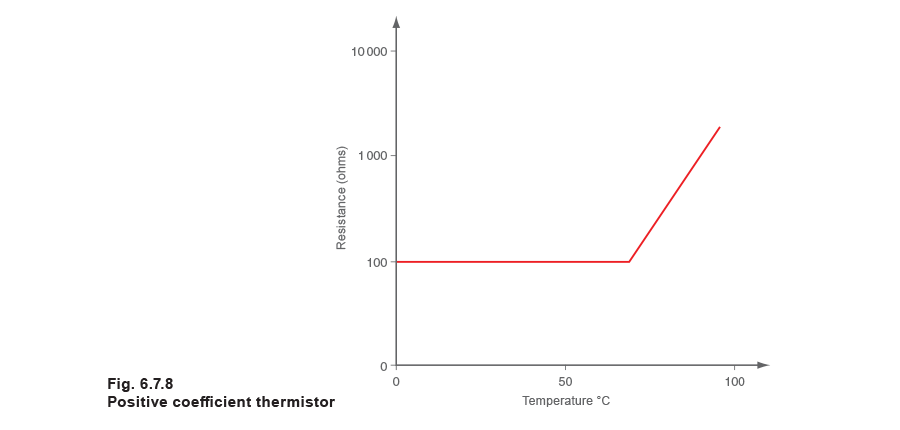Positive coefficient thermistors can be manufactured where the resistance increases with rising temperature (Figure 6.7.8) but their response curve makes them generally unsuitable for temperature sensing.