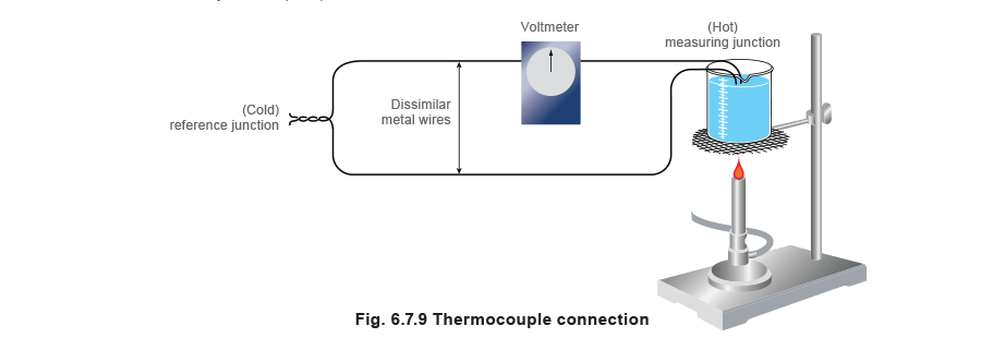 If two dissimilar metals are joined at two points and heat is applied to one junction (as shown in Figure 6.7.9), an electric current will flow around the circuit. Thermocouples produce a voltage corresponding to the temperature difference between the measuring junction (hot) and the reference junction (cold).