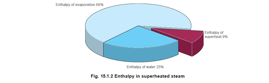 Although superheated steam contains a large amount of heat energy, this energy is in three forms; enthalpy of water, enthalpy of evaporation (latent heat) and enthalpy of superheat. The bulk of the energy is in the enthalpy of evaporation, and the energy in the superheat represents a smaller proportion.