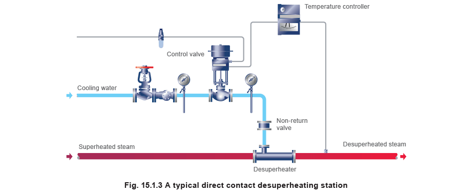 Control of the amount of water to be added is usually achieved by measuring the temperature of the steam downstream of the desuperheater. The set temperature of the desuperheated steam would typically be 3°C above that at saturation. Therefore, in such arrangements the inlet pressure of the superheated steam should be kept constant.