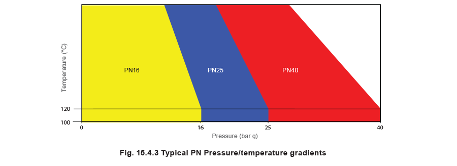 Figure 15.4.3 depicts typical pressure / temperature gradients for PN16, PN25 and PN40 rated products on a non-specific material. It is important to note that different materials will, by specification, produce variations in the temperature gradient.