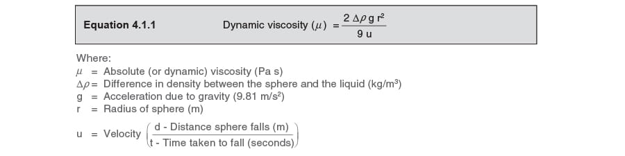 A sphere is allowed to fall through a fluid under the influence of gravity. The measurement of the distance (d) through which the sphere falls, and the time (t) taken to fall, are used to determine the velocity (u).