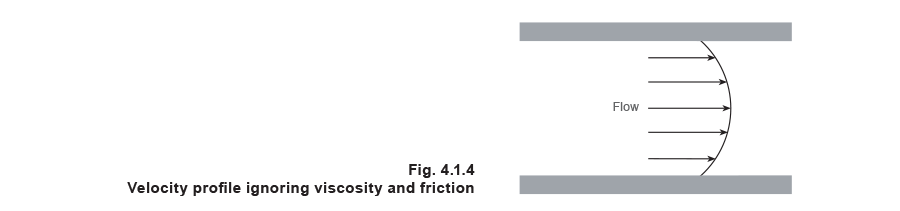 However, this is very much an ideal case and, in practice, viscosity affects the flowrate of the fluid and works together with the pipe friction to further decrease the flowrate of the fluid near the pipe wall. This is clearly illustrated in Figure 4.1.4: