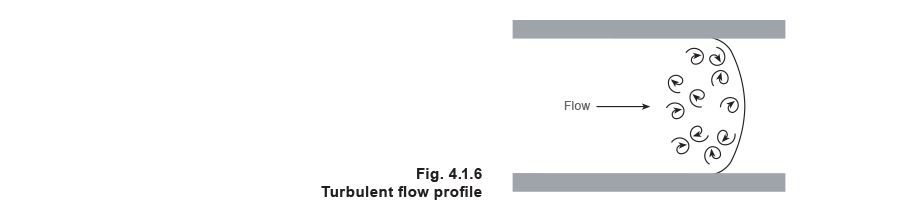 At low Reynolds numbers (2 300 and below) flow is termed ‘laminar’, that is, all motion occurs along the axis of the pipe. Under these conditions the friction of the fluid against the pipe wall means that the highest fluid velocity will occur at the centre of the pipe (see Figure 4.1.5).