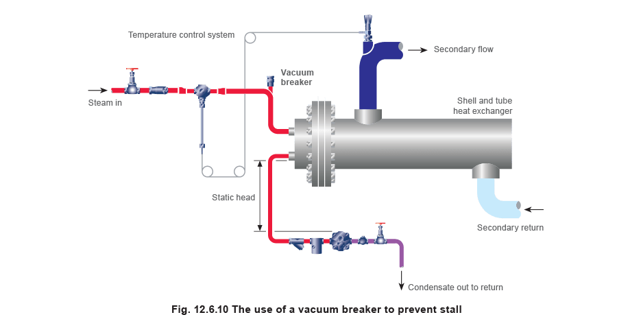 A common application of vacuum breakers is on temperature-controlled heat exchangers that are likely to suffer from stall (see Block 13). On smaller heat exchangers draining to atmosphere, the stall condition can be avoided by installing a vacuum breaker on the steam inlet to the heat exchanger. When the vacuum is reached in the steam space, the vacuum breaker opens to allow condensate to drain down to the steam trap.