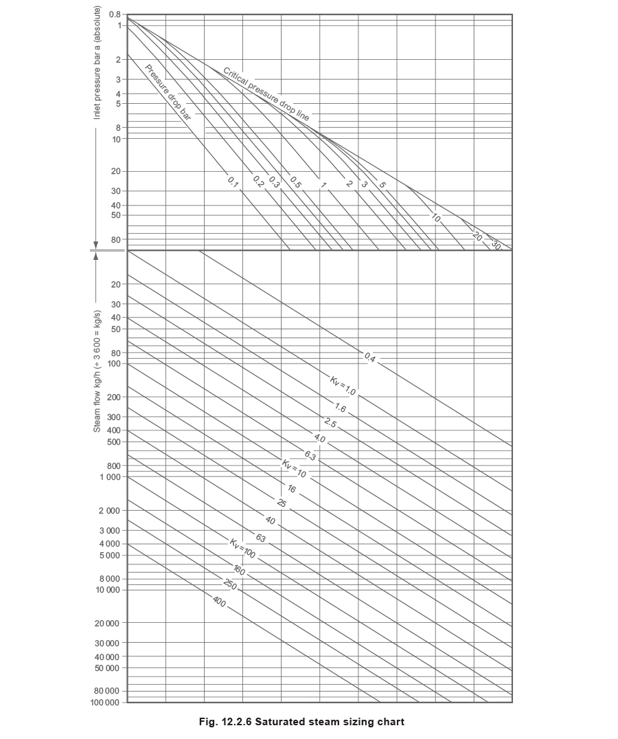 With knowledge of the typical operating pressure, and the mass flowrate, it is possible to determine the pressure drop across a chosen valve. Alternatively, if the maximum acceptable pressure drop is known, it is possible to select a suitable valve size. Although there are many formulae and charts available to predict the relationship between flowrate and pressure drop, the following simplified empirical formula (Equation 3.21.1) produces reliable results for steam and is therefore commonly used: