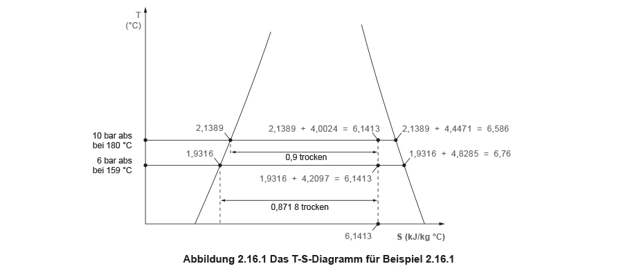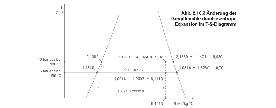Das in Abbildung 2.16.1 und nochmals in Abbildung 2.16.3 dargestellte T-S-Diagramm zeigt eindeutig, dass der Dampf in Beispiel 2.16.1 bei einer isentropen Entspannung feuchter wird (von 0,9 bei 10 bar abs auf 0,871 8 bei 6 bar abs).