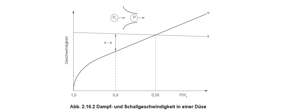 Wenn man für Sattdampf die Kurven für die Dampfgeschwindigkeit (u) und die Schallgeschwindigkeit (s) für eine konvergente Düse (Abbildung 2.16.2) aufzeichnet, stellt man fest, dass sich die Kurven tatsächlich beim kritischen Druckabfall schneiden. P1 ist der Vordruck und P ist der Druck an der engsten Stelle.